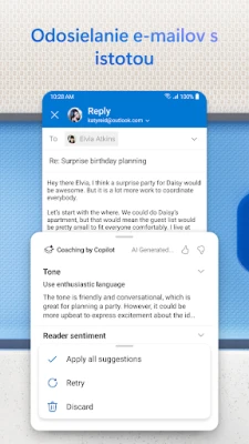 Už žiadne hľadanie v záplave správ! Aplikácia Outlook pre Android premení vašu doručenú poštu na inteligentné centrum, ktoré uprednostňuje to najdôležitejšie. Vďaka funkcii Prioritná doručená pošta okamžite vidíte e-maily, ktoré si vyžadujú vašu pozornosť, zatiaľ čo menej naliehavé správy sú šikovne usporiadané. Predstavte si, ako ušetríte drahocenný čas a zameriate sa len na to podstatné, s plynulým ovládaním pomocou gest potiahnutia prstom a inteligentných filtrov, ktoré udržia poriadok vo vašej digitálnej komunikácii.