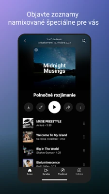 **YouTube Music** prichádza s inteligentným prístupom k objavovaniu, ktorý sa plne prispôsobí vašim preferenciám. Užite si personalizované mixy a rozmanité výbery šité na mieru vášmu vkusu, ako aj mixy optimalizované pre vaše denné aktivity – od intenzívneho tréningu po pokojný večer. Objavujte trendy a nové tóny prostredníctvom Mixu novej hudby alebo Mixu noviniek. Preskúmajte bohatstvo žánrov ako hiphop, pop, elektronika, jazz, K-pop či rock, alebo si zvoľte hudbu podľa nálady – na sústredenie, romantiku či párty. Môžete tiež spoločne s priateľmi alebo inými fanúšikmi vytvárať dokonalé zoznamy skladieb a rozširovať svoju prispôsobenú knižnicu obľúbených interpretov a albumov.